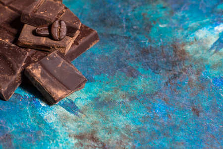 Broken pieces of chocolate on blue abstract background. Top view.