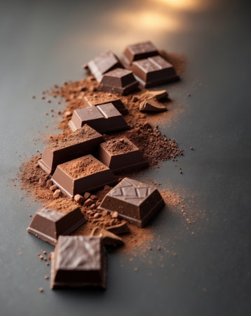 AI Generated. Chocolate Pieces and Cocoa Powder Arranged Creatively on Dark Background
