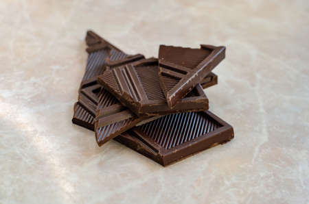 Chocolate bar pieces on marble table