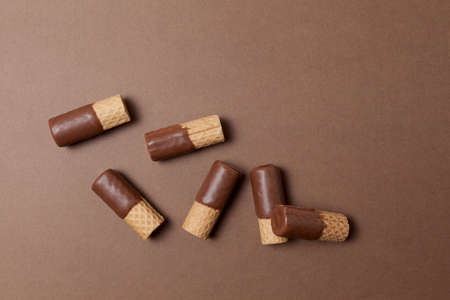 Wafer rolls half-coated in milk chocolate. Top view. Brown background, copy space.
