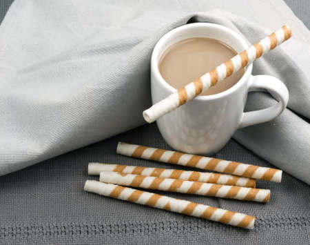 Chocolate Wafer Sticks and Cup of Coffee with Milk on Gray Background