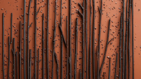 A striking image showcasing a stack of black rods against a vibrant orange textured wall, casting interesting shadows in bright natural light, perfect for artistic designs.