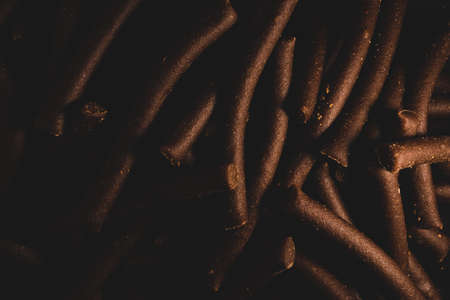 Dog food pattern made with dry snacks sticks. Flat lay texture in brown earthy tones. Home pets, animals feeding. Special diet, training supply. Top view background.