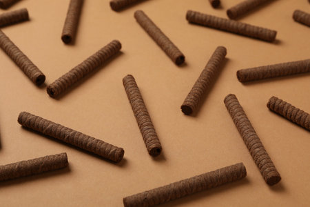 Flat lay with chocolate wafer rolls on brown background