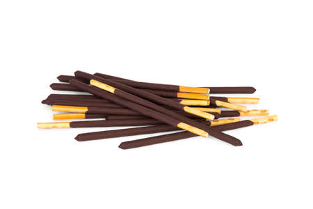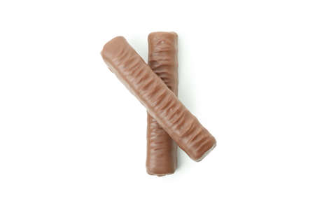 chocolate coated biscuit sticks on white background