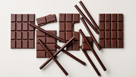 Rich dark chocolate bars and sticks are arranged creatively on a smooth surface.