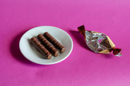 Three chocolates in white saucer on pink background. Sweet treats and candy wrapper on colored surface. Confectionery