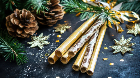 Colorful golden decoration items lay on a dark surface surrounded by pine branches and pine cones embodying the spirit of Christmas crafting.