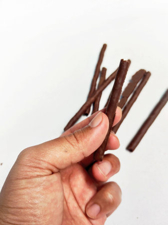 Chocolate sticks in hand on a white background. Selective focus.