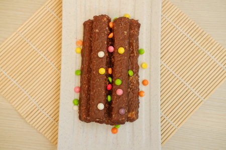 A delightful chocolate-coated snack sticks sprinkled with nuts, perfect for sweet cravings and dessert enthusiasts in a minimalistic setting.