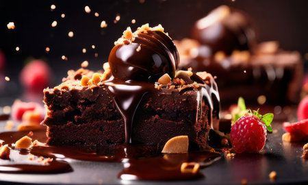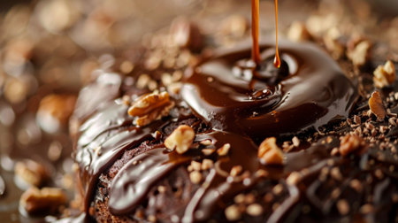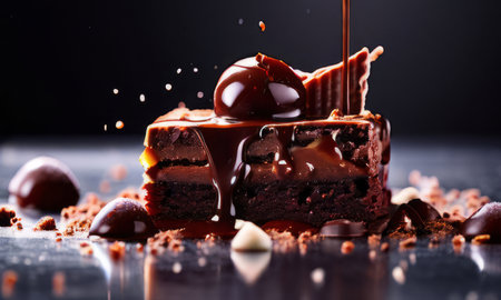 A close up of chocolate with a drizzle of chocolate sauce. Concept of indulgence and decadence, as the rich chocolate and sauce create a luxurious and tempting appearance