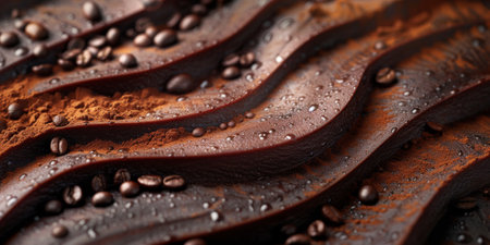A creative digital illustration depicting Commercial creative design featuring dark chocolate ripple surfaces with glossy peaks, abstract food-inspired texture, warm overhead lighting, indulgent gourmet elegance, deep cocoa and shadow tones. This AI-generated artwork features unique visual elements suitable for various commercial and editorial applications. AI-generated illustration.