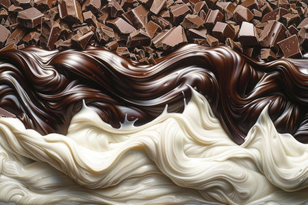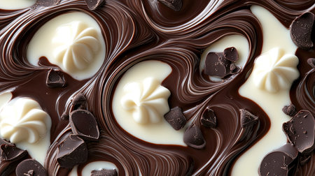 This stunning image showcases the artistic swirls of milk and dark chocolate, interspersed with creamy decorative elements, perfect for culinary inspiration.