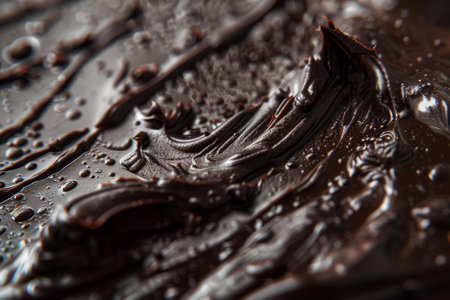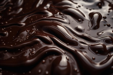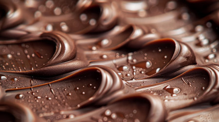 Close-up of smooth, melted chocolate with glossy texture and water droplets, capturing the rich and indulgent appeal.