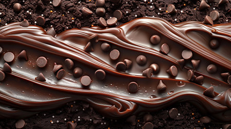 A chocolate drizzle is falling on a pile of chocolate chips. Concept of indulgence and sweetness, as the chocolate drizzle adds a layer of richness to the chocolate chips