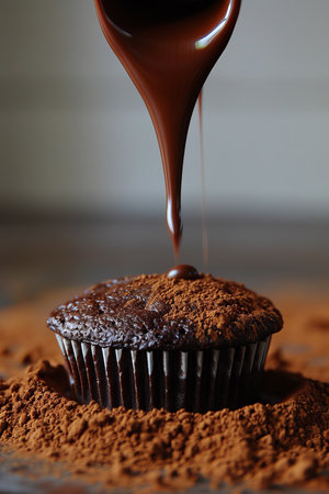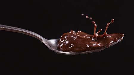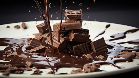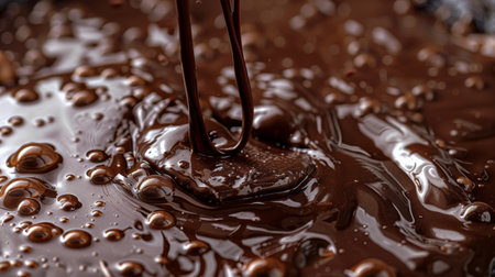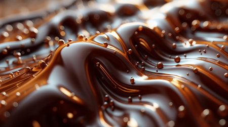 The glistening surface of liquid chocolate undulates smoothly, creating intricate patterns as droplets splash and catch the light. This captivating close-up showcases the rich, velvety texture, inviting a sense of sensory delight. Generative AI