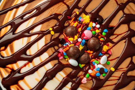 Melting chocolate ice cream topped with colorful sprinkles on a dark surface