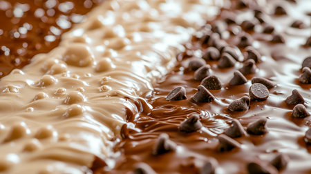 A detailed shot showing an array of glossy chocolate spreads infused with cocoa nibs and chocolate chips, inviting indulgence and flavor exploratio