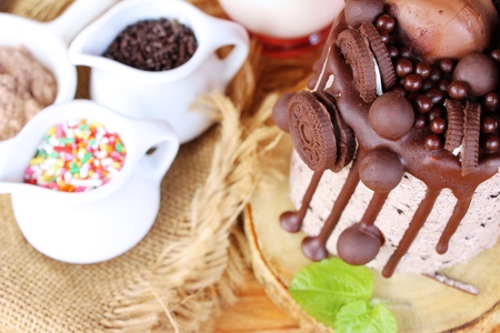 Chocolate cake for men with chocolate decorations and the streaks of chocolate.