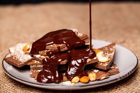 Hot chocolate pouring on candies in white plate on sackcloth. Copy space.