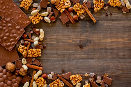 closeup stack of chocolate bars with nuts on a wooden table with copy space