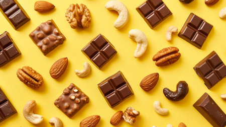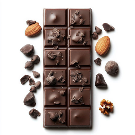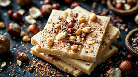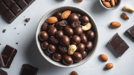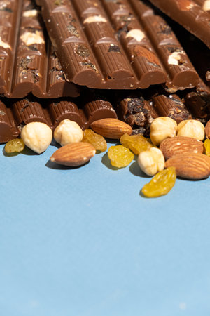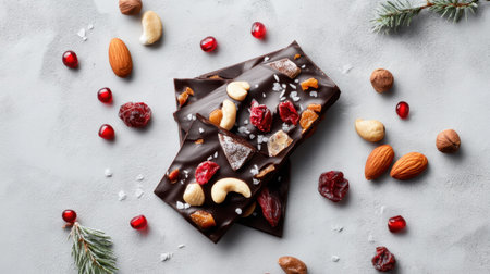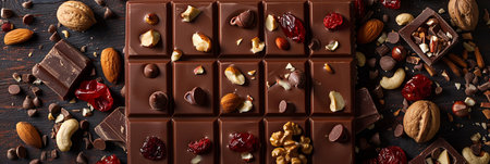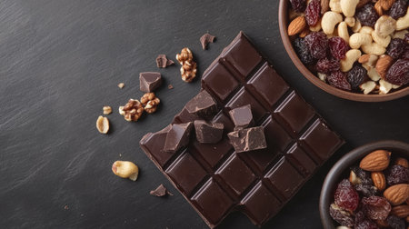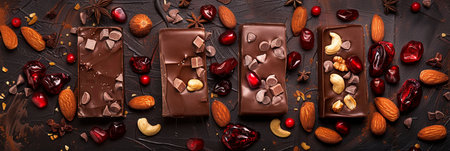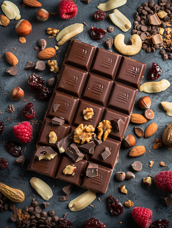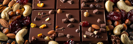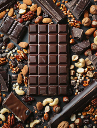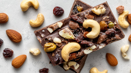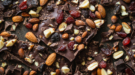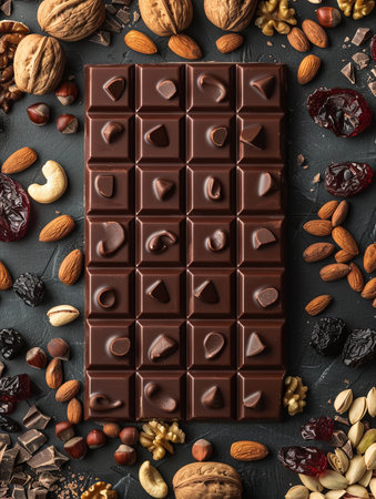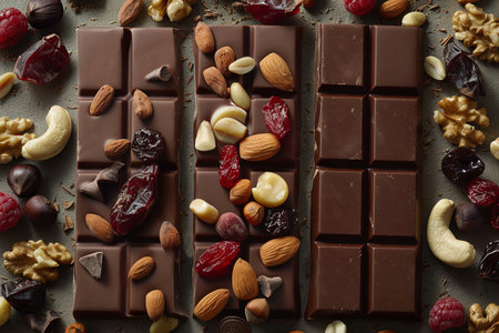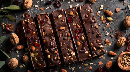 A visually appealing setup of chocolate bars featuring a mix of nuts and dried fruits. Ideal for showcasing healthy snacking options and dessert ideas.