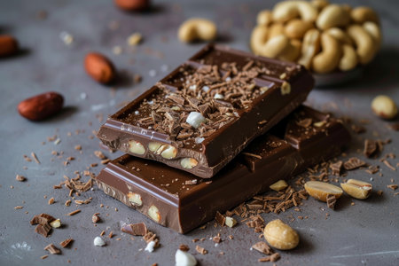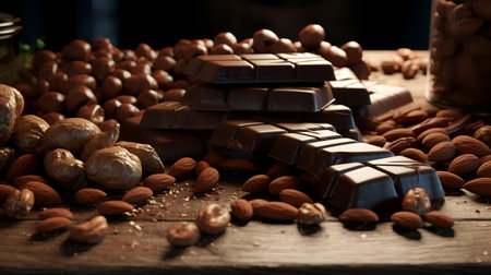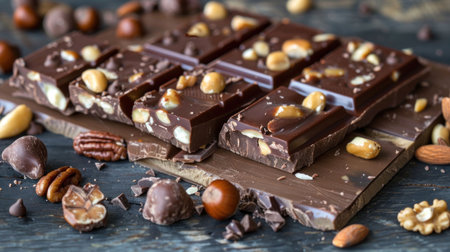 Chocolate bars with nuts scattered on a wooden surface, rich dark chocolate color, indulgent dessert concept, perfect for food photography, delicious treats for chocolate lovers
