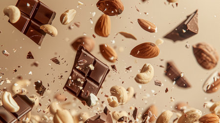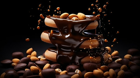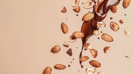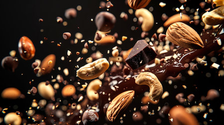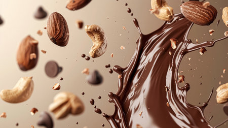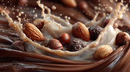 A captivating splash of smooth chocolate blends with various nuts, creating a visually stunning and delectable dessert scene. The rich textures and colors invite the viewer to indulge in this delightful fusion of flavors, perfect for culinary inspiration.