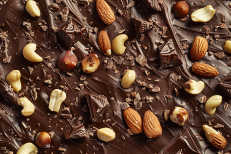 Various nuts scattered over melted chocolate. Rich texture of chocolate background
