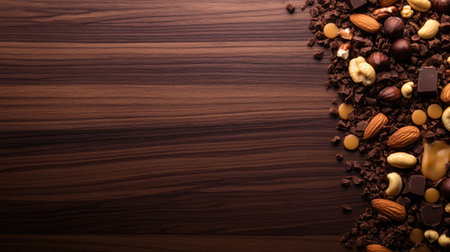 Top view of chocolate bars and variety of nuts on beige brown split background. Healthy snacks concept. Generative AI.