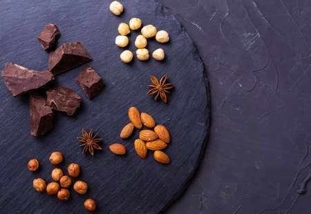 nuts and pieces of chocolate on wooden background. delicious chocolate bars with almond and hazelnuts on a brown background. Sweet food