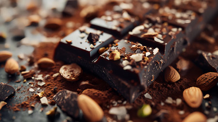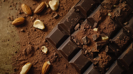 Close-up of rich dark chocolate surrounded by almonds and cocoa powder. This image highlights indulgence and gourmet quality for culinary needs.