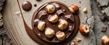 AI Generated. Delicious hazelnut praline chocolate with chunks and liquid chocolate on a textured surface offering space for text or branding elements