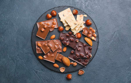 Pieces of tasty chocolate with hazelnuts and almonds on dark table, top view