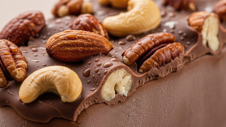 Detailed close up of a chocolate bar filled with crunchy nuts, a tempting treat with rich textures.