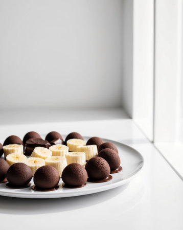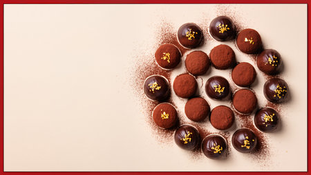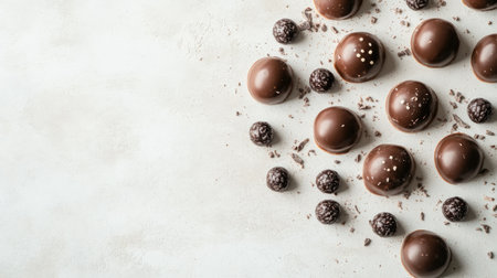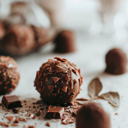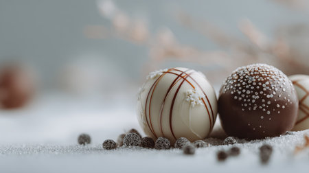 Capture the essence of indulgence with elegant chocolate truffles displayed atop a soft white surface, accented by delicate natural decor, inviting festive joy.