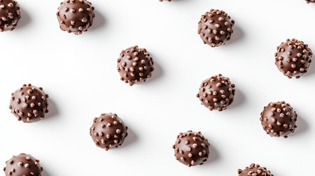 A minimalist composition of chocolate-covered treats arranged symmetrically on a smooth white surface.