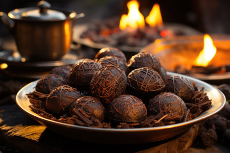 Candy brigadeiro truffles with chocolate on a plate on a brown Brazilian brown woo, generative IA