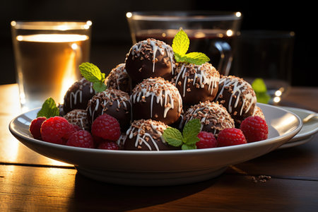 Three exquisite chocolate truffles are artistically arranged, topped with fresh mint leaves, and surrounded by scattered raspberries against a softly lit backdrop.