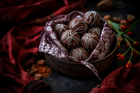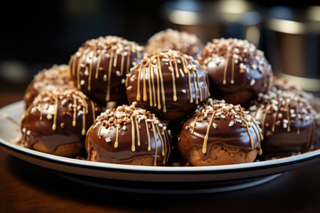 AI Generated. Delicious chocolate truffles topped with nuts and coconut on a decorative plate