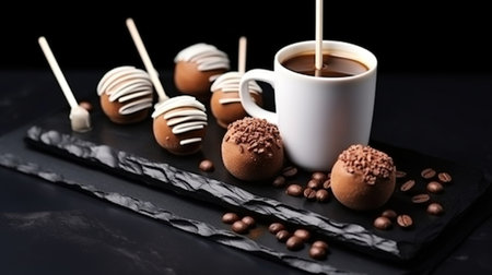 Cake pops on a slate board on a black background with coffee beans. Delicious dessert with chocolate and milk cream on a stick. Generative AI