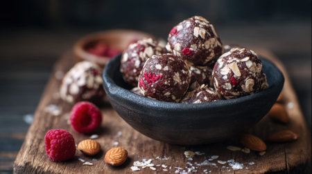 Homemade chocolate raspberry energy bites in rustic bowl with almonds and oats.