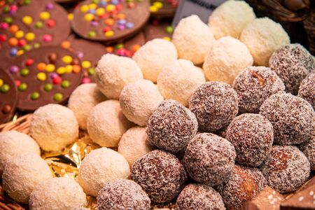 Chocolates with coconut sweet filling, chocolates with sugar and coconut flavor