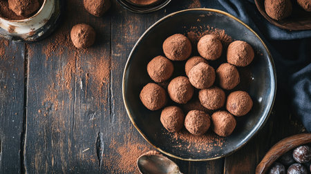 A creative overhead view of homemade chocolate truffles dusted with cocoa powder, arranged on a rustic table, showcasing artisanal craftsmanship.