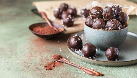 Vegan chickpea and peanut butter candies in chocolate glaze sprinkled with coconut chips. energy balls. Healthy raw dessert without sugar.