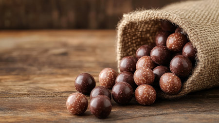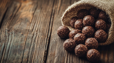 A tempting view of chocolate candy balls spilling from a burlap sack onto a rustic wooden table, ideal for dessert decorations and snack ideas.