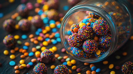 A glass jar spills colorful sprinkles and candy balls onto a wooden table, creating a vibrant and festive atmosphere perfect for sweet treat photography.