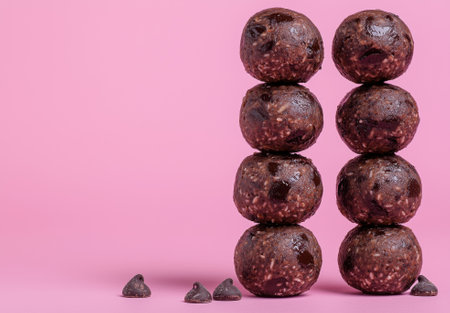 A collection of healthy chocolate-covered protein snacks, scattered on a smooth background with open space.
