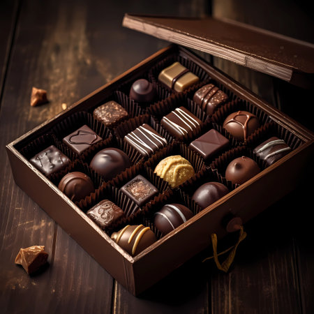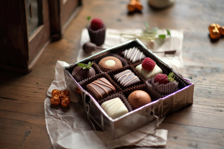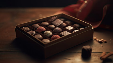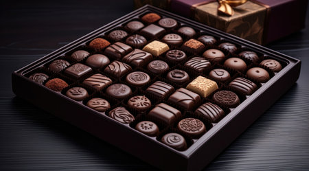 Box of chocolates on a wooden table, gourmet chocolate candy, generative AI