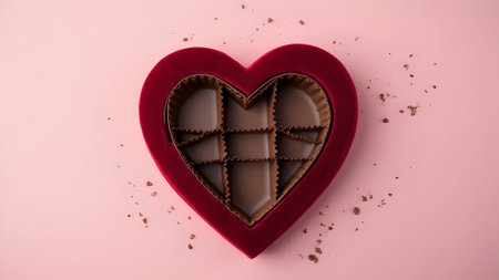 Chocolate heart-shaped box on a pink background, top view